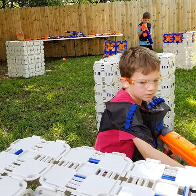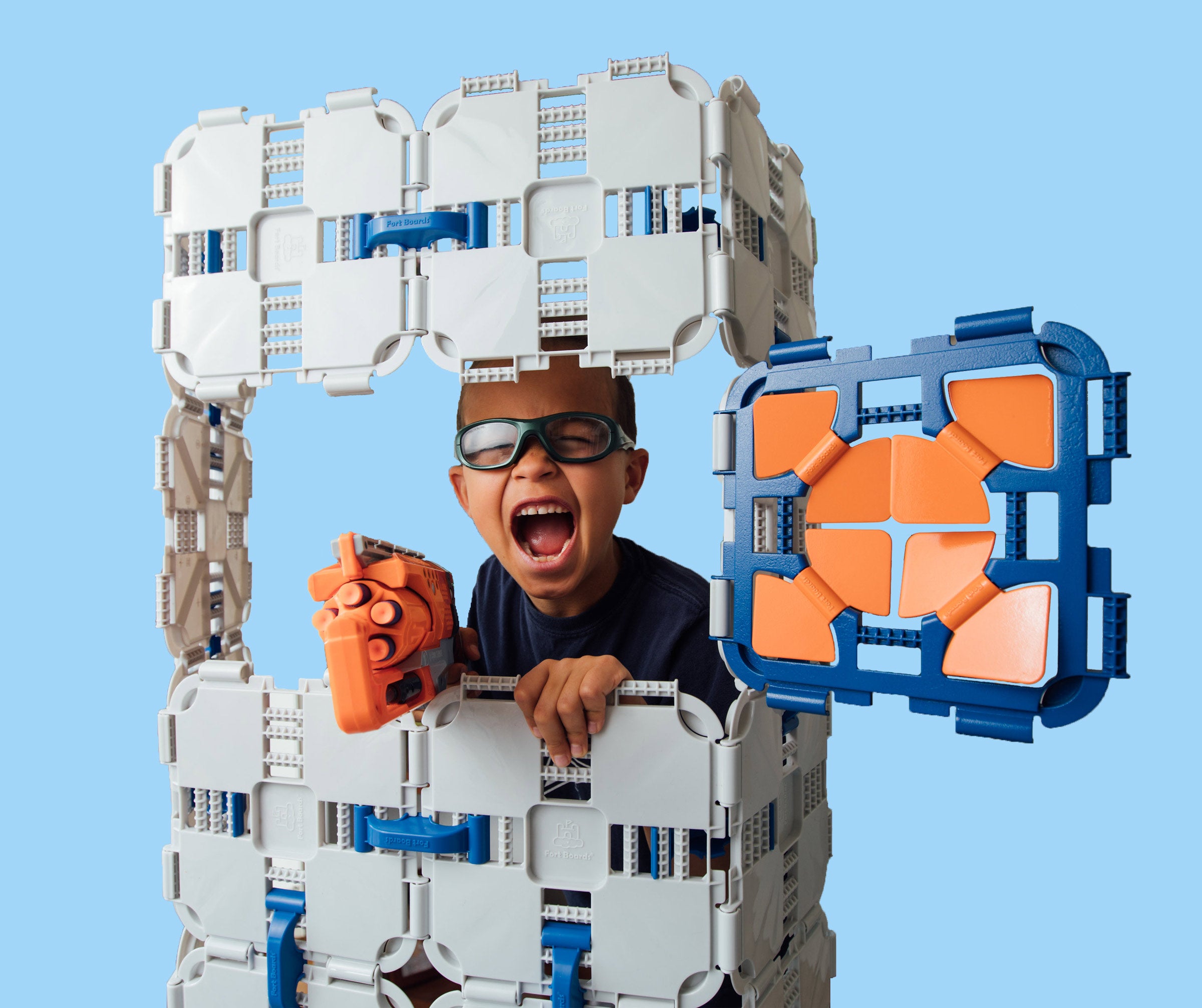 While Blaster Boards builds bunkers up to four feet tall, all the parts stack down to a shoe box size, for easy transportation or storage. Inside or outside, this open-ended toy can handle even the most intense Nerf wars!
