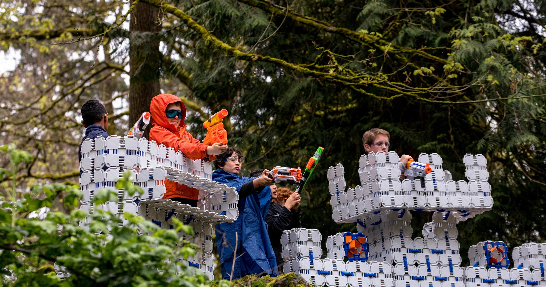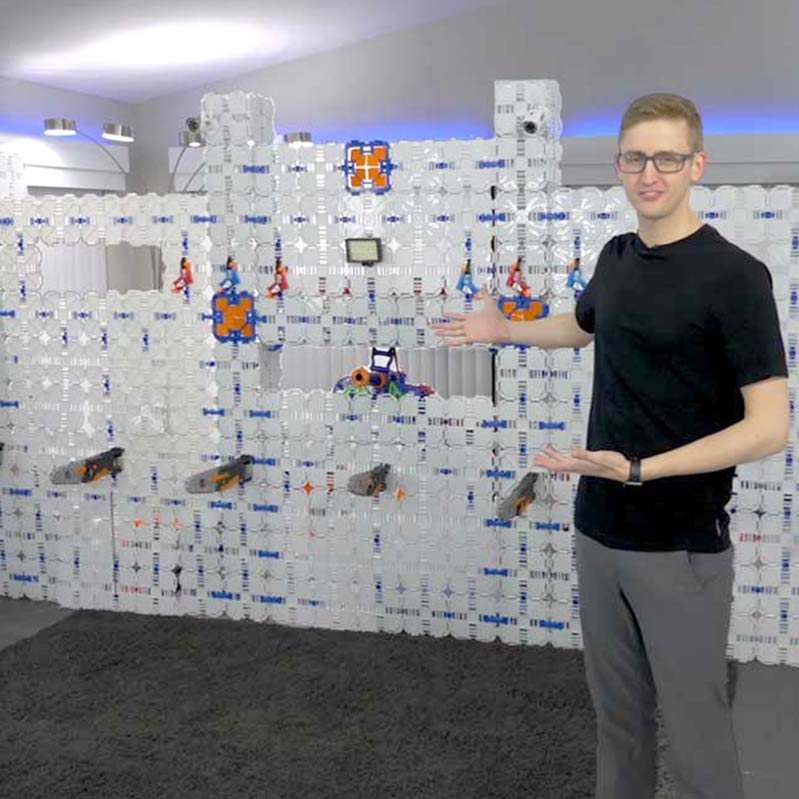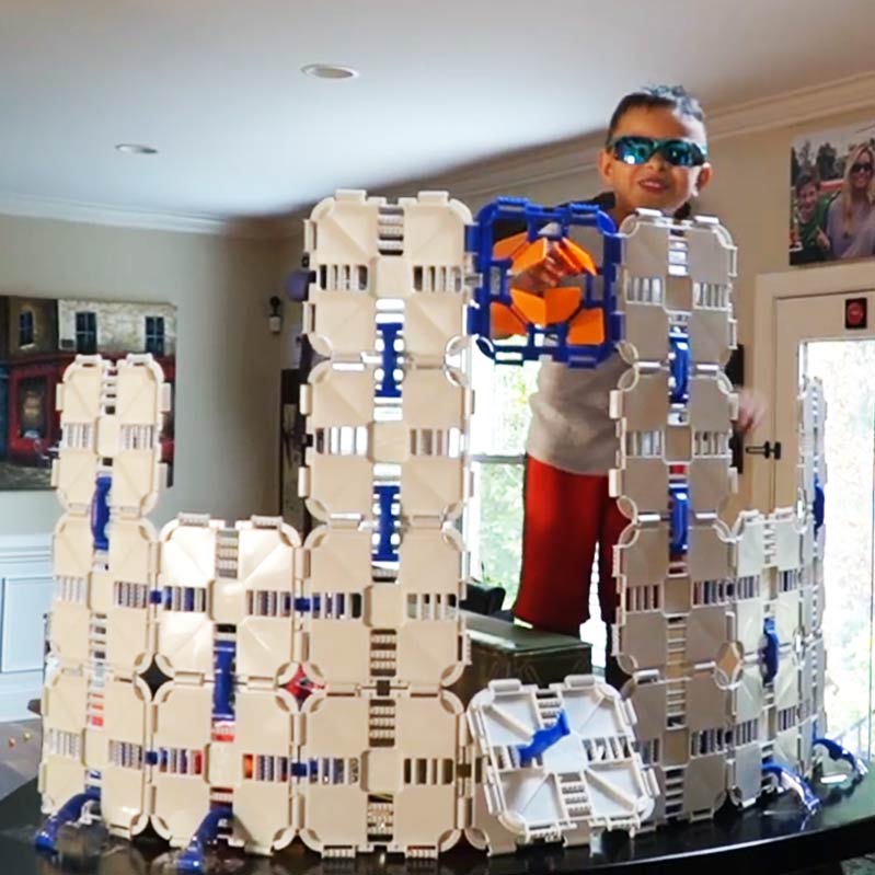 While Blaster Boards builds bunkers over seven feet tall, all the parts stack down to a shoe box size, for easy transportation or storage. Inside or outside, this open-ended toy can handle even the most intense Nerf wars!