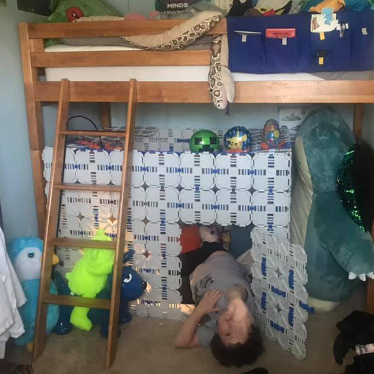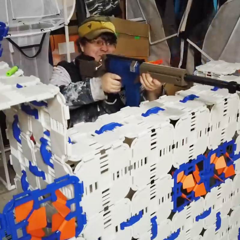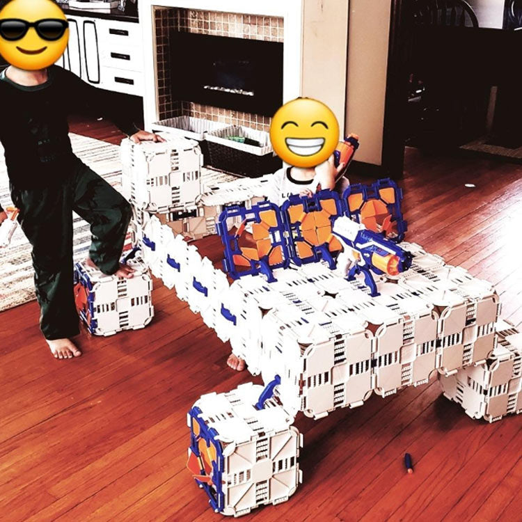 While Blaster Boards builds bunkers over 6 feet tall, all the parts stack down to a shoe box size, for easy transportation or storage. Inside or outside, this open-ended toy can handle even the most intense Nerf wars!