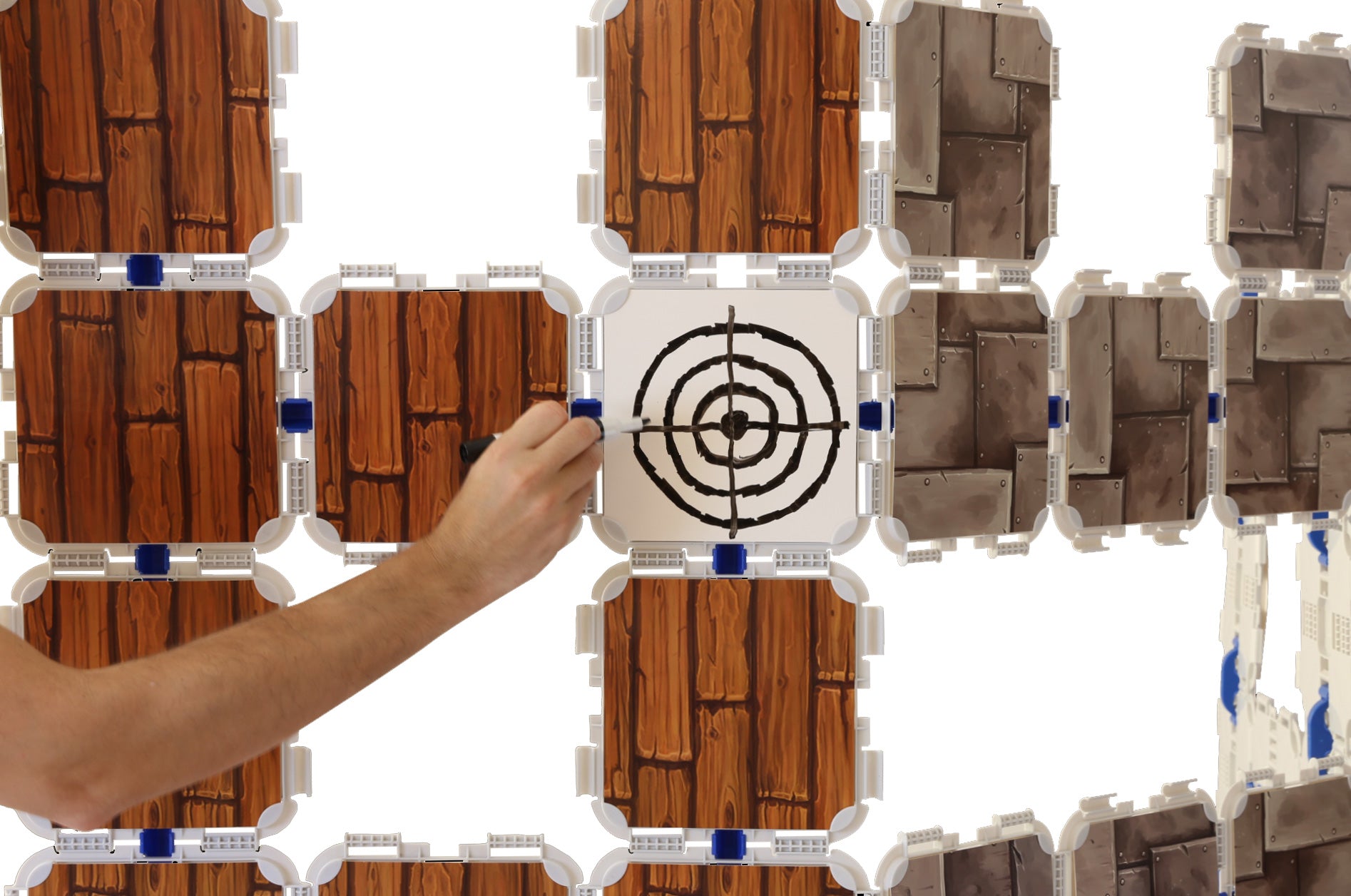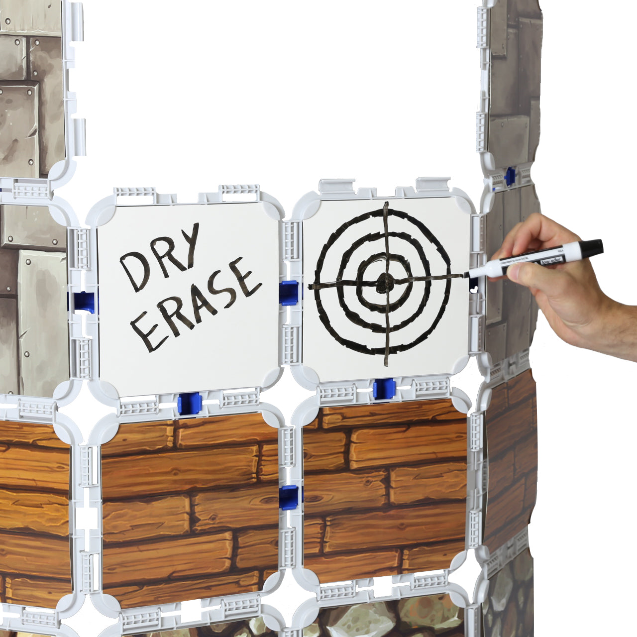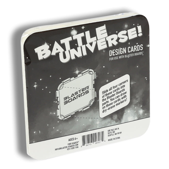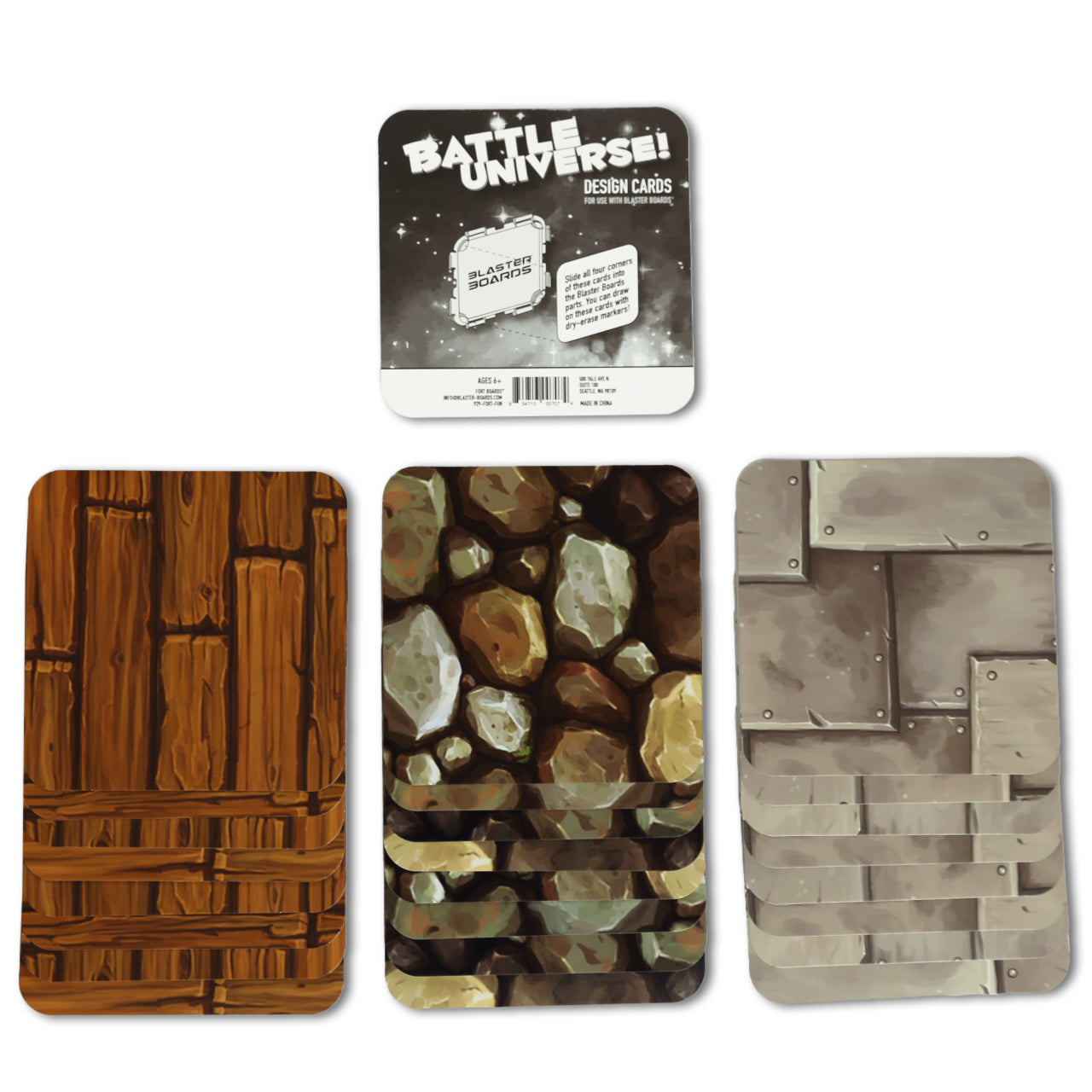 These design cards fit into all Fort Boards & Blaster Boards parts. Each Design Card pack contains 8 wood designs, 8 metal designs, and 8 stone designs. Dry erase markers (not included) can be used on the white backside of each card.